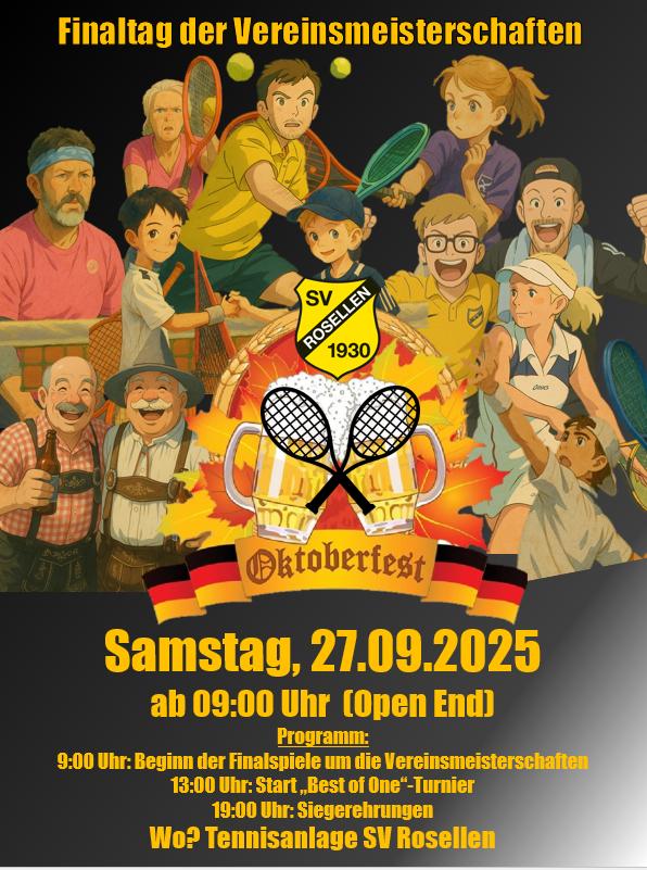 Die Tennisabteilung des SV Rosellen lädt Mitglieder und Externe zu ihrem großen Finaltag der Vereinsmeisterschaften sowie zum parallel stattfindenden Oktoberfest am Samstag, den 27. September, ein.