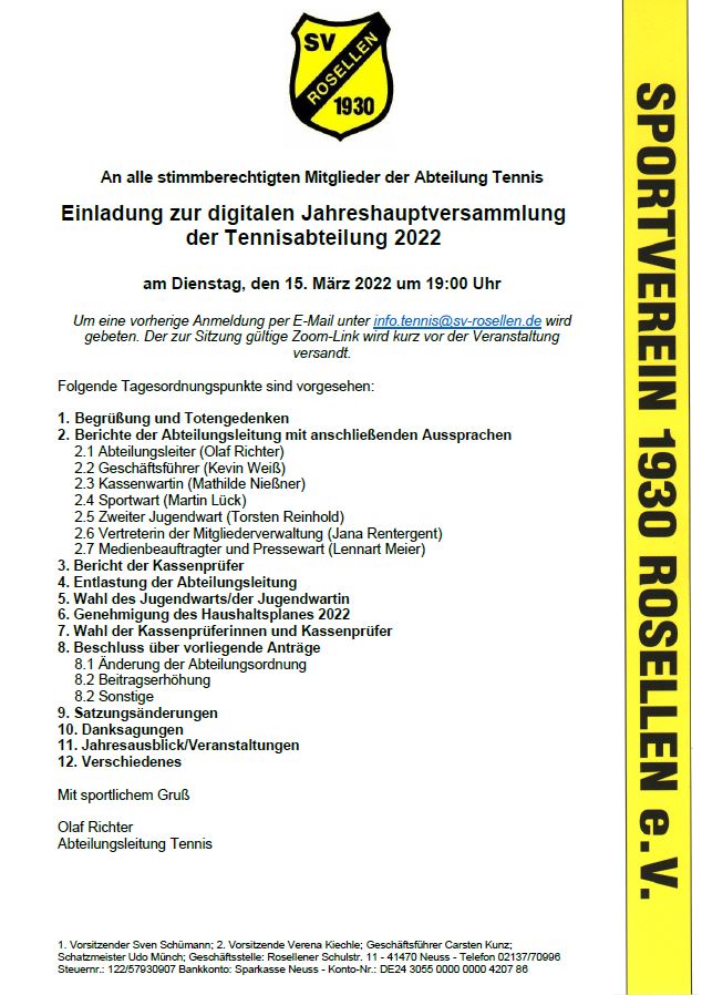 Die Tennis-Abteilungsleitung hat auf ihrer vergangenen Sitzung beschlossen, die kommende Jahreshauptversammlung am 15. März um 19:00 Uhr wie im letzten Jahr digital über Zoom abzuhalten. Ausschlaggebend für die Entscheidung war, dass angesichts der bereits zahlreich eingegangenen Anmeldungen und der aktuell wieder stark steigenden Covid-19-Zahlen kein unnötiges Risiko für die Mitglieder eingegangen werden soll.