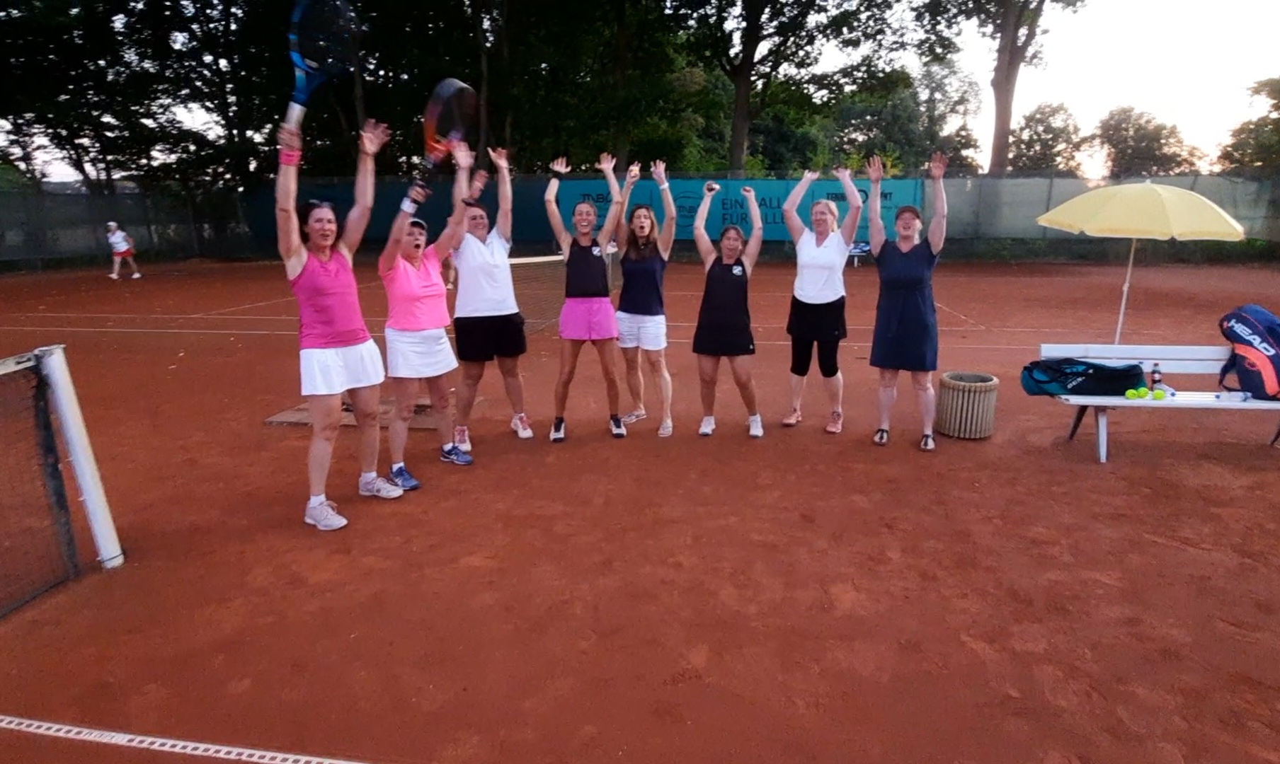 Die Damen 40/2 hatten bereits einen Tag zuvor für Furore gesorgt. Das Team von Sandra Libertus setzte sich in einer umkämpften und erhitzten Begegnung (nicht nur wegen extrem warmer Temperaturen über 30 Grad) verdient gegen Tabellenführer und Ligafavorit SG Neukirchen-Hülchrath mit 6:3 durch. Zugute kamen der Mannschaft gleich drei Einzel-Erfolge im Matchtiebreak, die von Daniela Klösters (4:6; 6:3; 10:4), Sabine Caffier (6:7; 6:4; 10:2) und Ria Weinbrenner (6:7; 6:0; 10:8) eingefahren wurden. Darüber hinaus gelang Andrea Bastian ein hoher Zwei-Satz-Sieg (6:0; 6:1). In den Doppeln legten die Paarungen Sabine Caffier/Daniela Klösters (6:2; 6:4) und Iris Meier/Andrea Bastian (6:3; 6:4) mit Einbruch der Dunkelheit souverän nach. Ein Sieg, der bewies, dass sich Rosellener Damen nicht so einfach aus der Ruhe bringen lassen.
