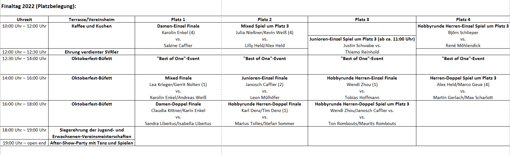 Der Saisonhöhepunkt rückt näher: Am Samstag, den 24. September finden der große Finaltag der Vereinsmeisterschaften und das Oktoberfest unserer Abteilung statt. Nun wurde der Zeitplan für den Finaltag veröffentlicht.