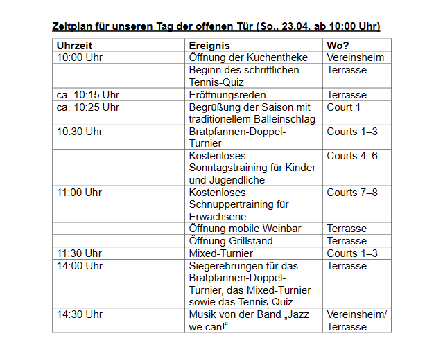Das ist der Zeitplan für den Tag der offenen Tür der Tennisabteilung