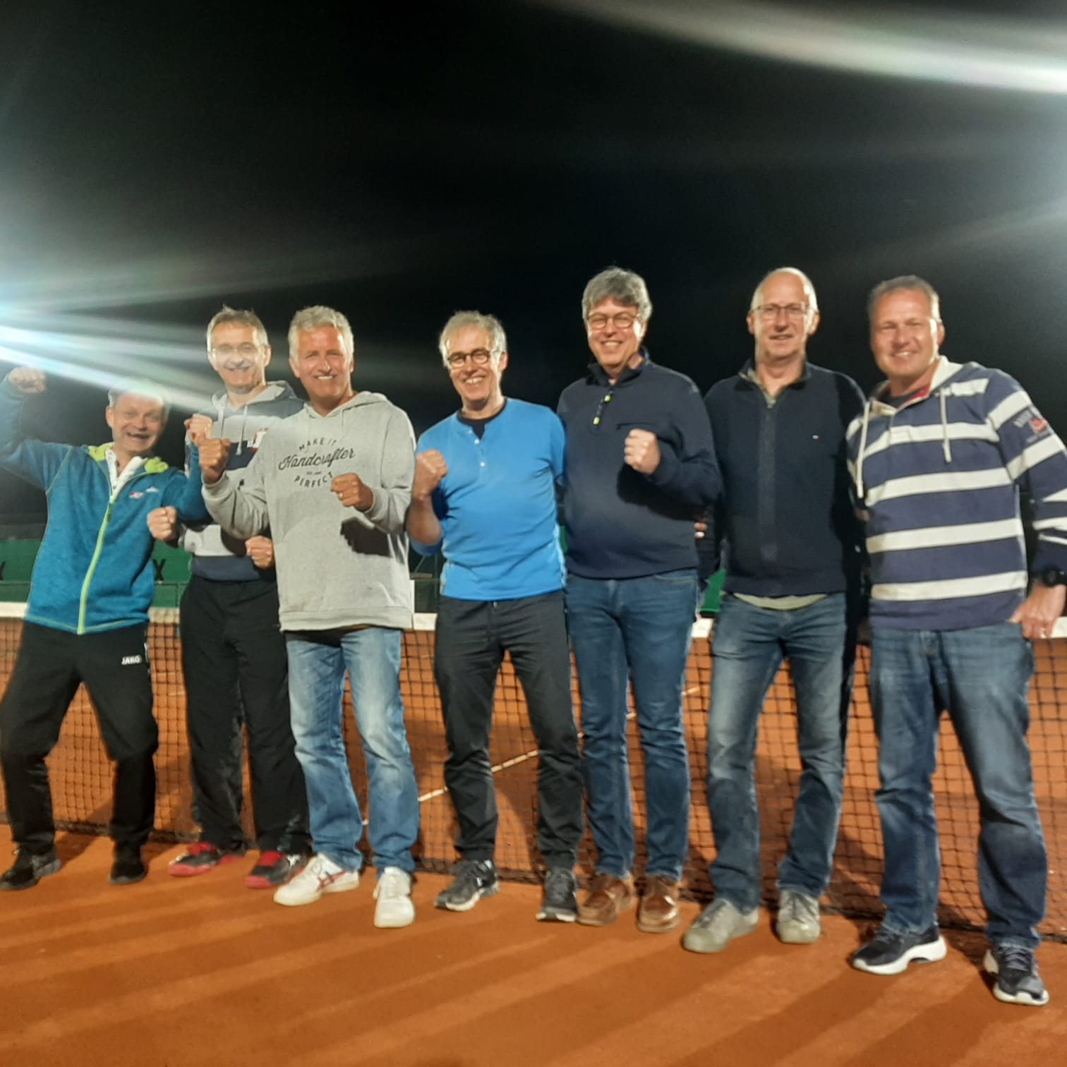 Auch die Herren 55 konnten ein Jahr nach ihrem Abstieg sofort mit einem Erfolgserlebnis aufwarten. Olaf Richter, Harald Jansen, Dieter Weiß sowie die Doppelpaarungen Michael Steinig / Harald Jansen und Olaf Richter / Dieter Weiß sicherten einen knappen, aber verdienten 5:4-Erfolg bei BW Wevelinghoven und verdienten sich eine anschließende Lichter-Show.