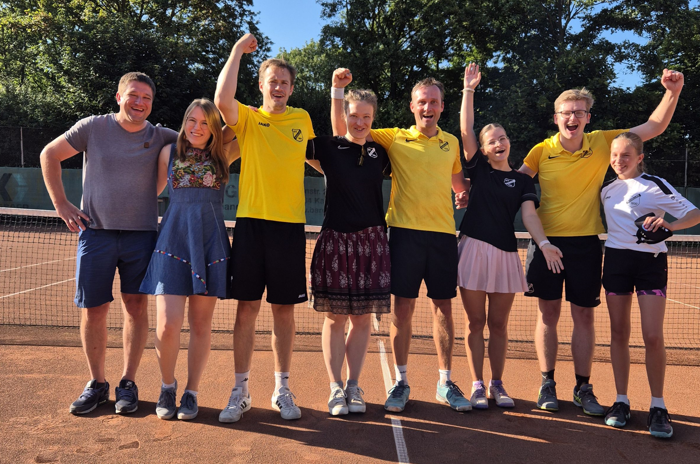 Unser Team der Offenen Klasse hat einen starken 4:2-Erfolg eingefahren. Bei sympathischen Gastgebern aus Büttgen waren es Gerrit Nolten und Tobias Göbels, die für zwei ungefährdete Rosellener Punkte nach Einzeln sorgten. Sabine Schukalla wäre an Damen-Einzel-Position zwei gegen eine LK-17erin fast eine Sensation gelungen. In den Doppeln hatten dann Paula Berger/Lennart Meier und Tamina Tolles/Marius Tolles einen starken Lauf, der kurzzeitig nur durch den knuffigen Platzsturm eines Hundes gestoppt werden konnte. Am Ende standen auch hier zwei klare SVR-Erfolge auf der Anzeigetafel. Am Samstag feiert unsere Mannschaft gegen den vor allem mit Verbandsligaspielerinnen und -spielern besetzten Tabellenführer aus Schiefbahn ihren Saisonabschluss. Hauptsache, es stehen genug Kaltgetränke bereit.