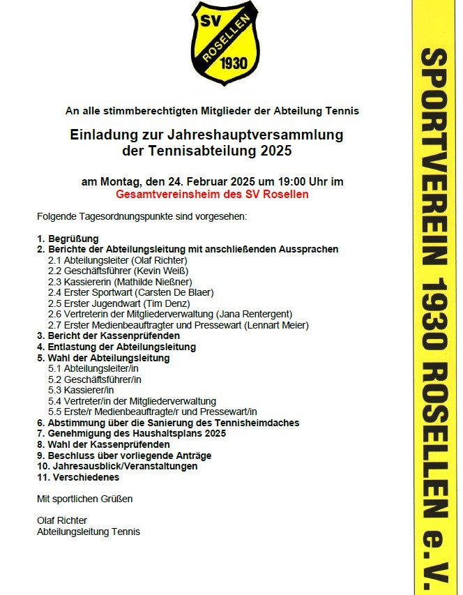 das Jahr ist noch gar nicht so alt und schon steht der erste Höhepunkt bevor. Wir laden Euch für Montag, den 24. Februar um 19:00 Uhr zu unserer Jahreshauptversammlung ins Gesamtvereinsheim des SV Rosellen am Rasenfußballplatz ein.