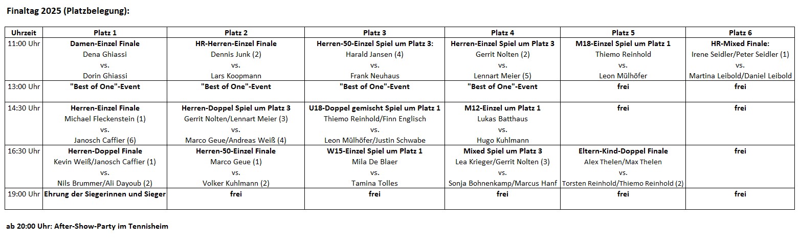 Am Samstag, den 27. September steht wieder das Highlight der Tennissaison an! Mit ihrem Finaltag der Vereinsmeisterschaften und Oktoberfest rundet die Tennisabteilung des SV Rosellen eine weitere tolle Sommersaison ab. Zwischen 11:00 Uhr und 19:00 Uhr werden den Zuschauerinnen und Zuschauern insgesamt 15 Matches geboten. Um 13:00 Uhr gibt es zudem noch das beliebte anderthalbstündige Best-of-One-Event, bei dem über 40 Mitglieder an den Start gehen. Gegen 19:00 Uhr erfolgen die Ehrungen der Jugend- und Erwachsenen-Konkurrenzen.